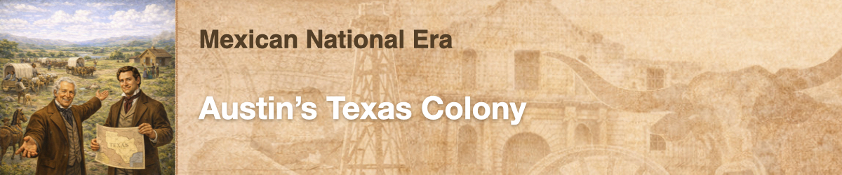 Overview In this experience, students learn about Moses and Stephen Austin and their role in the settlement of Texas. They read about the Austin colony and land grant conditions and requirements. Then they work in small groups to prepare a recruitment poster on behalf of the Austin colony. Students will collaborate in small groups for scene 3 and scene 4. Note that there are three interrelated experiences that deal with settlement of Texas in the period of 1821–1830: There are two general resources provided to students in the pack of all three experiences: a timeline of events in Texas history from 1826–1842 and a video (30 minutes). You can refer students to these resources at any point during these experiences. Objectives: