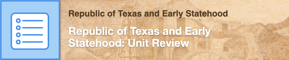 This user-friendly system allows you to administer online assessments and to view reports to help you assess student learning. There are two unit review tests for this unit, with 20 questions each. Review I covers the Texas revolution, and review II covers the Republic years. Student responses are automatically scored. If students exit the test without completing it, upon re-entry they will be taken to the last question they completed. If students click the End Test button on the last question, they will not be able to re-enter the test. Ensure that students are certain that they have completed the test before they click the button.