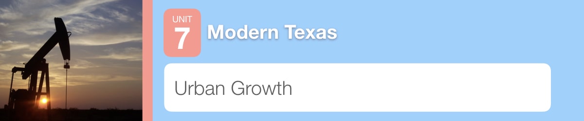 Until the twentieth century, Texas was mainly a state of farmers and ranchers. With the development of the oil and gas industries as well as other economic activity, many Texans moved to the towns and cities. In this lesson, you will learn about this process of urbanization.