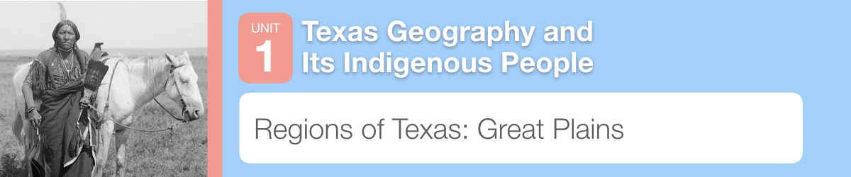 Texas is divided into four regions—the Mountains and Basins, the Great Plains, the North Central Plains, and Coastal Plains. The regions are determined by the physical geography, such as landforms, climate, and vegetation. In this experience, you will learn about the Great Plains.