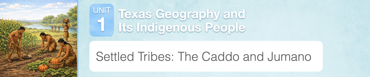 Some indigenous people in what is now Texas were sedentary, which means they settled in one place, often in villages. In this lesson you will focus on two of the indigenous groups that settled in Texas, the Caddo and the Jumano.