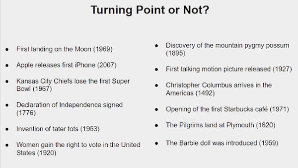Record the events your group believes were turning points in history.