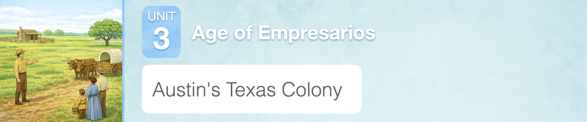 Students will collaborate in small groups for scene 1 to scene 4. Divide them into their small groups before beginning the experience. Note that there are three interrelated experiences that deal with settlement of Texas in the period of 1821–1830: There are two general resources provided in the Student Pack in all three experiences: a timeline of events in Texas history from 1826–1842 and a video (30 minutes). You can refer students to these resources at any point during these experiences. If you have access to leveled readers about Stephen F. Austin or the Old Three Hundred colony, assign them to the students in parallel to this experience. Estimated duration: 40-50 minutes Vocabulary words: Objectives