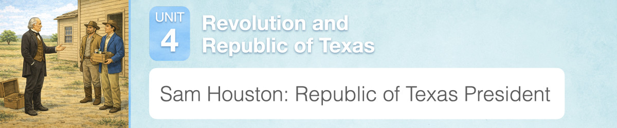 Texas had won its independence, and the Republic of Texas was now a new country. But the problems did not end when the Mexican Army retreated. When Sam Houston became president of Texas, he faced many challenges that made life difficult in the new republic. In this lesson, you will learn about some of these problems and how Houston responded to them.